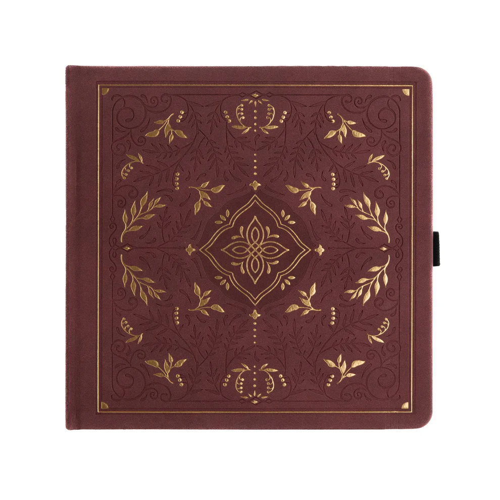 A charming notebook in deep plum vegan leather, designed with ornate gold detailing reminiscent of classic storybook covers. Its compact size and vintage-inspired aesthetic make it a thoughtful, giftable choice for readers, writers, and everyday creatives.