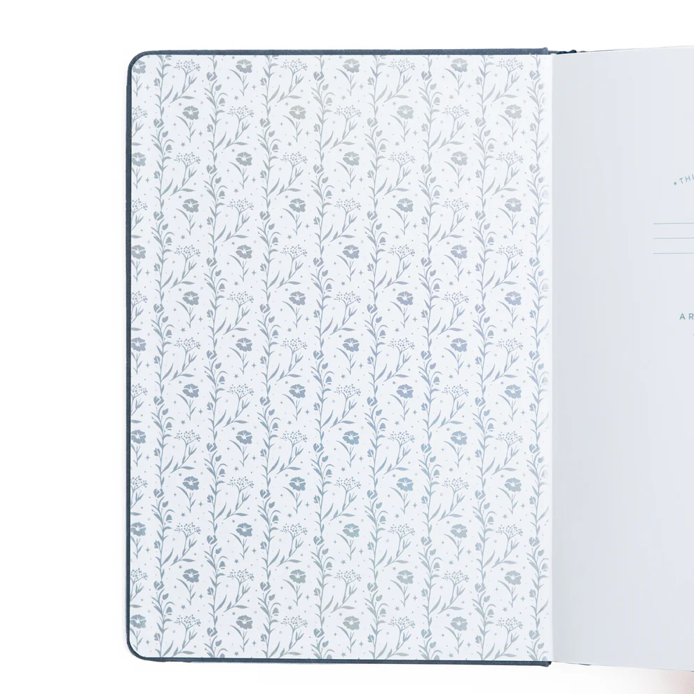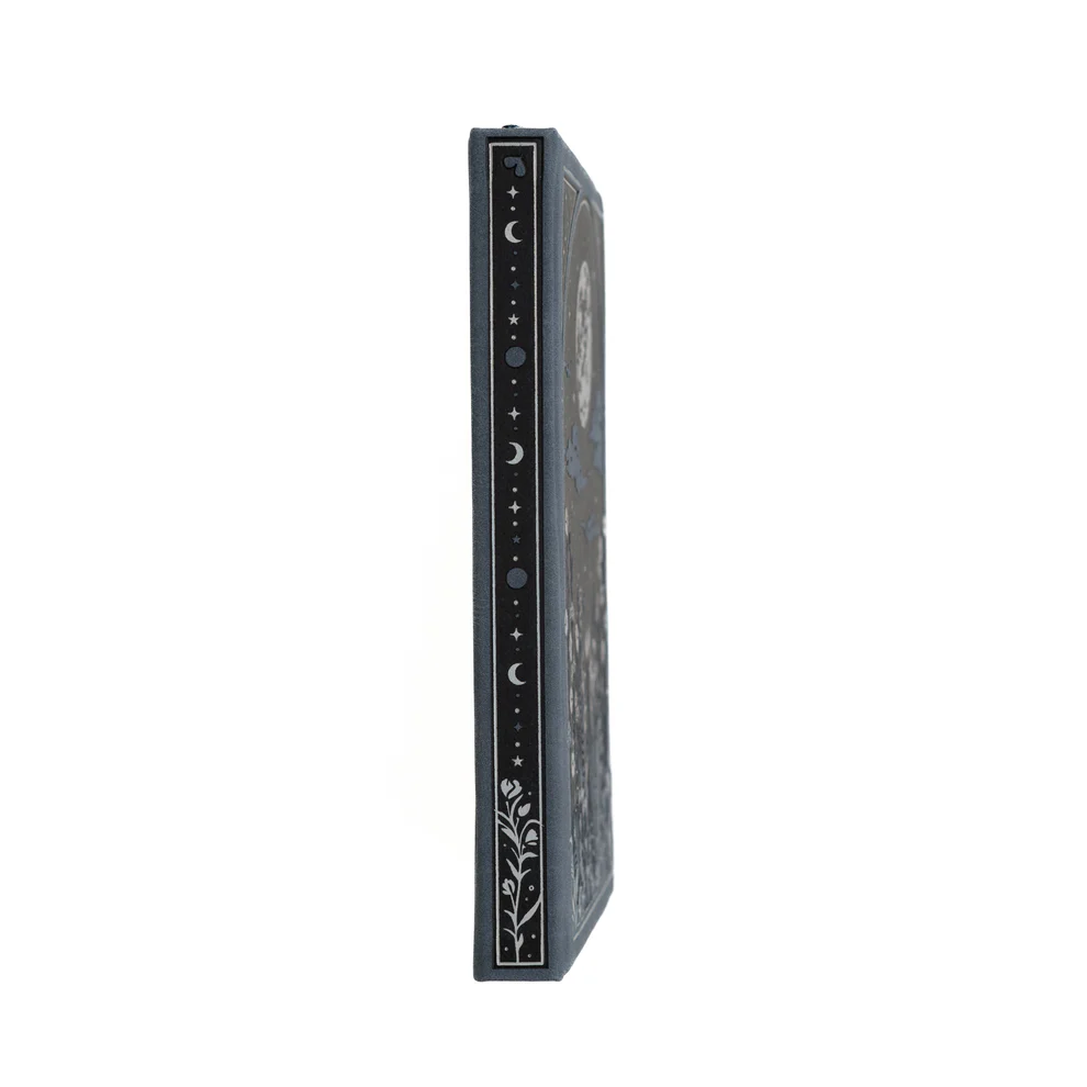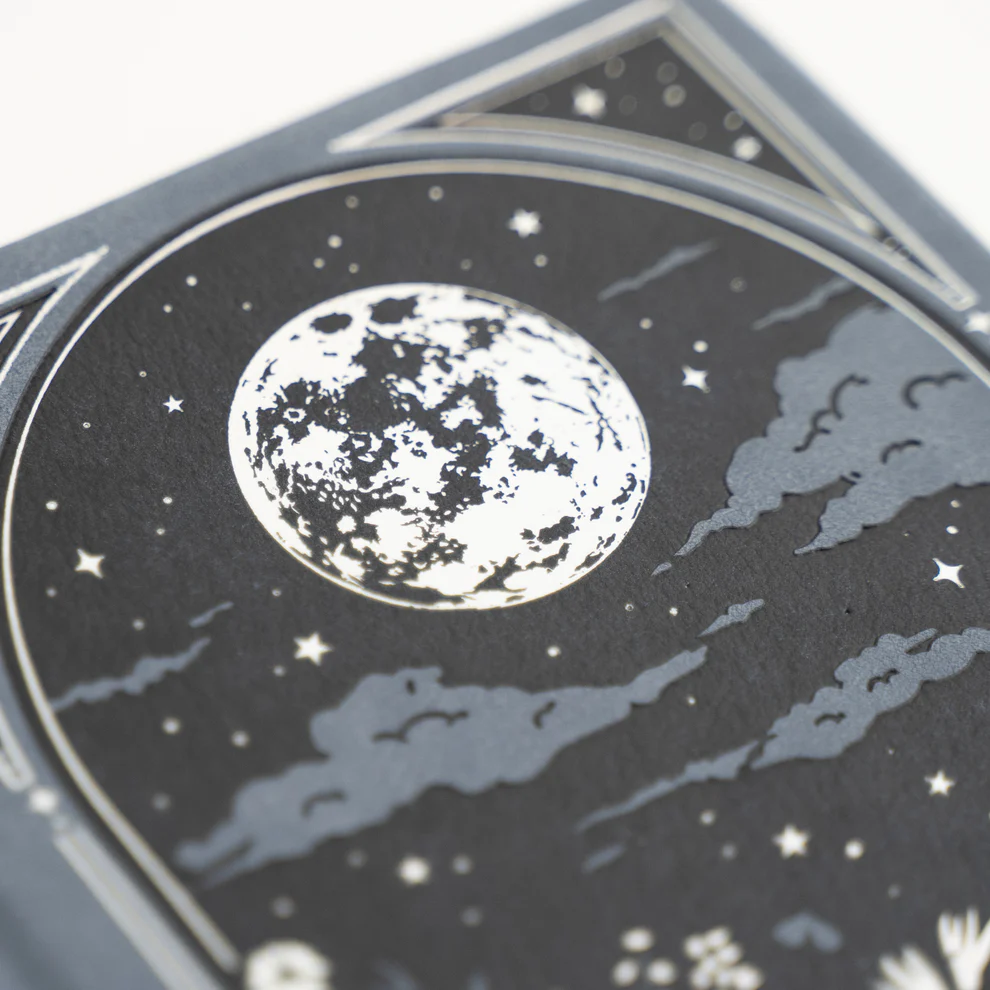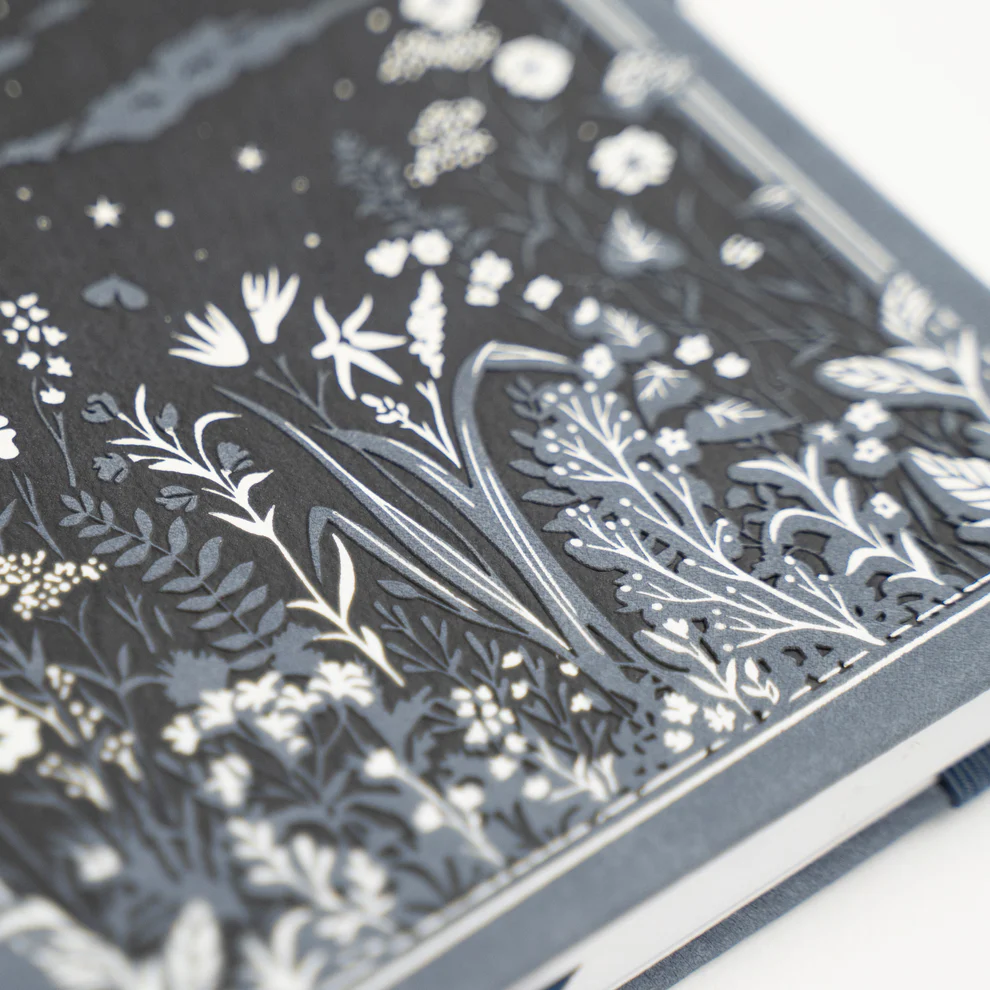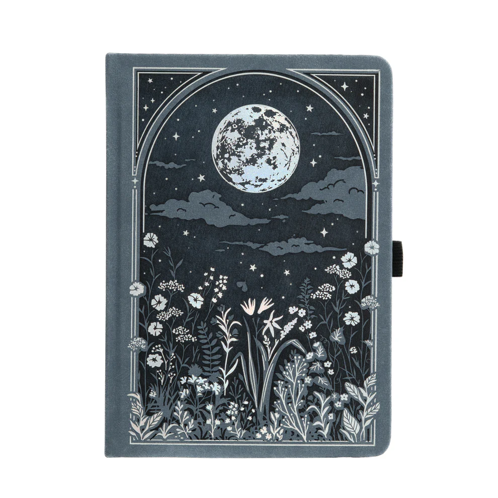 A beautifully atmospheric notebook featuring a moonlit sky framed by wildflowers and archway detailing. Soft blue vegan leather sets the stage for shimmering silver and white accents, creating a peaceful, enchanted design that appeals to journalers and nature lovers alike.