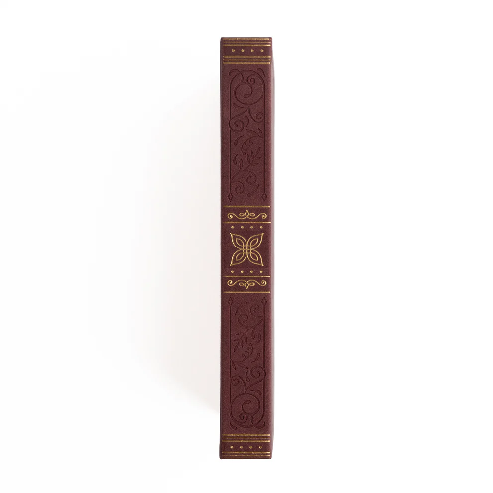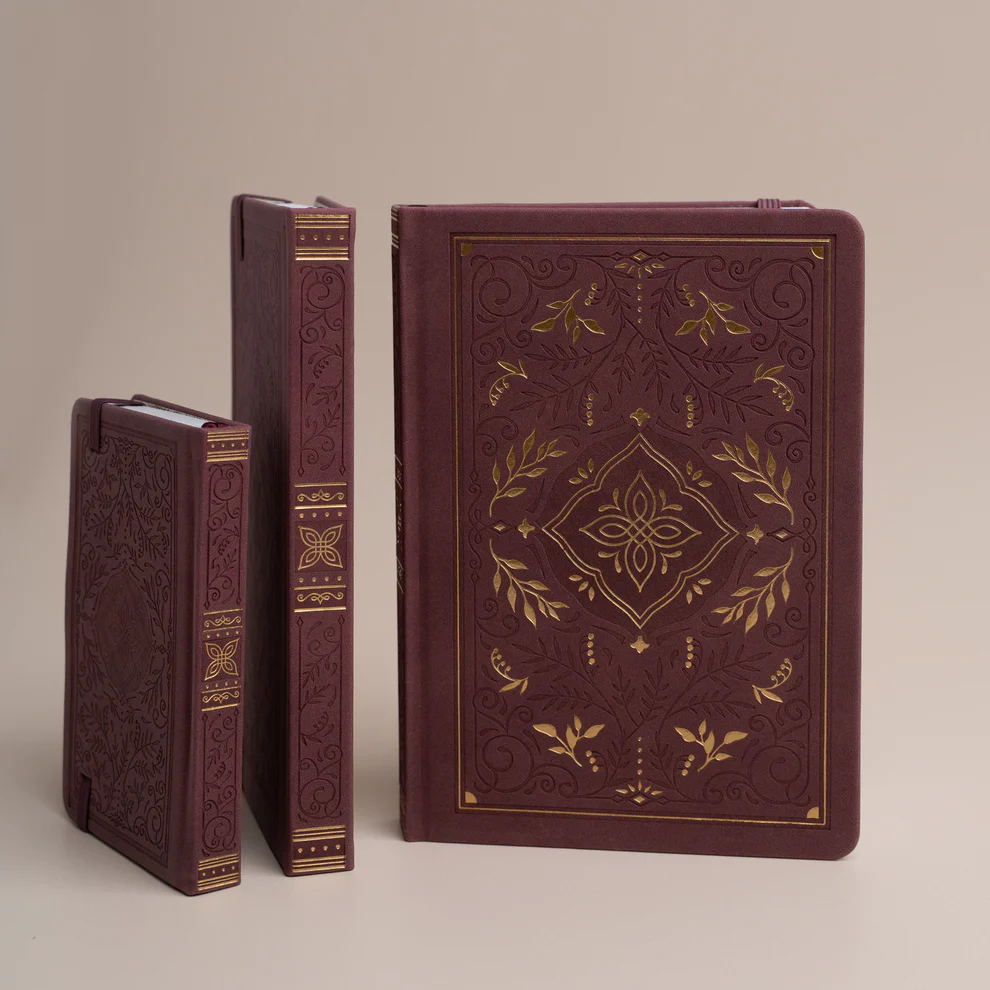 A charming notebook in deep plum vegan leather, designed with ornate gold detailing reminiscent of classic storybook covers. Its compact size and vintage-inspired aesthetic make it a thoughtful, giftable choice for readers, writers, and everyday creatives.