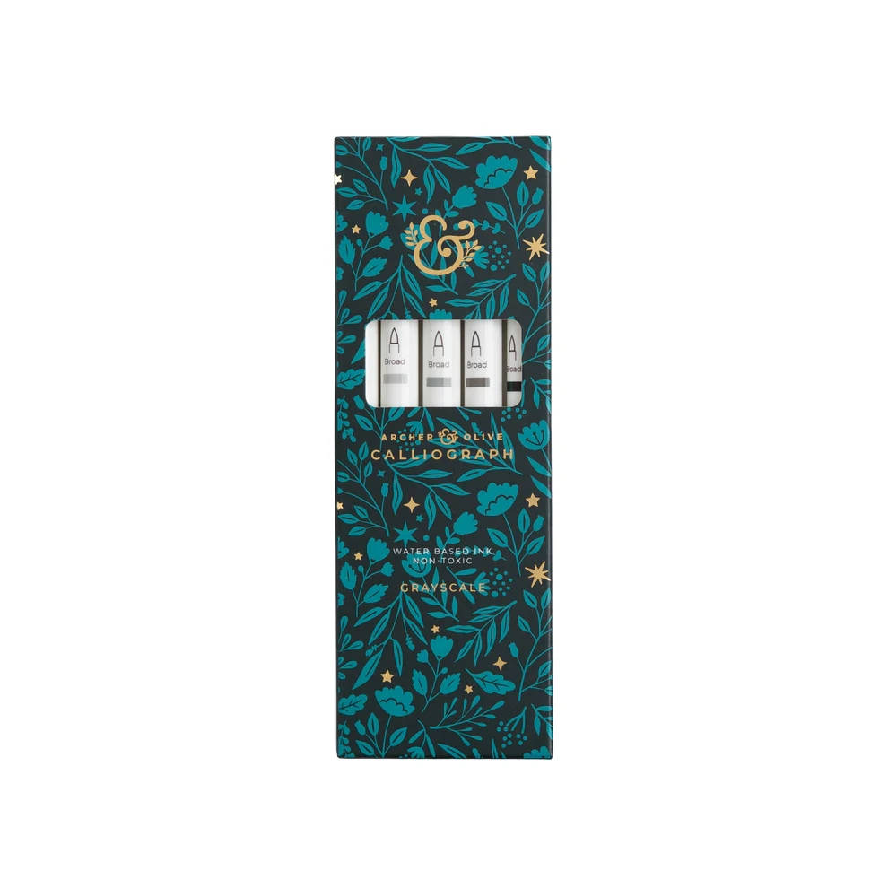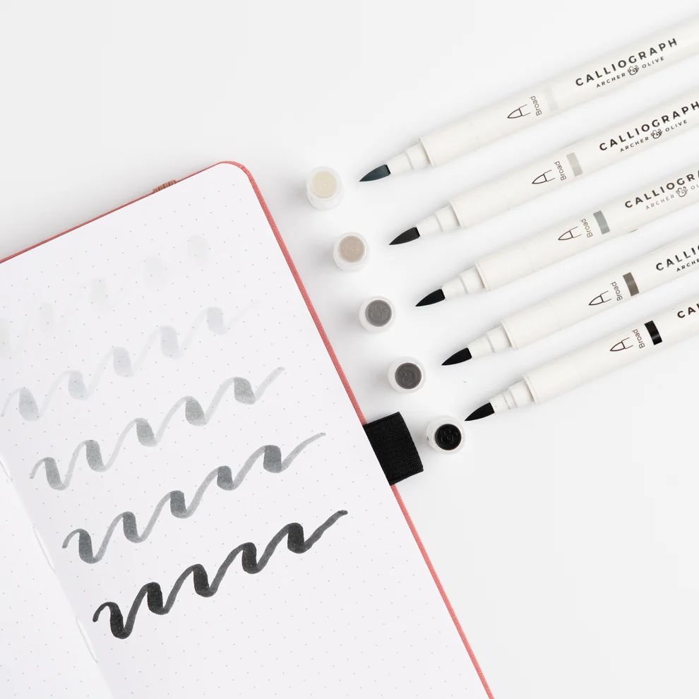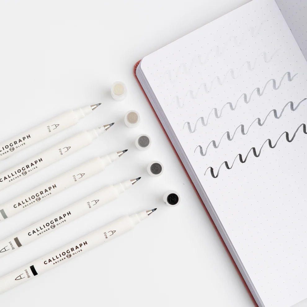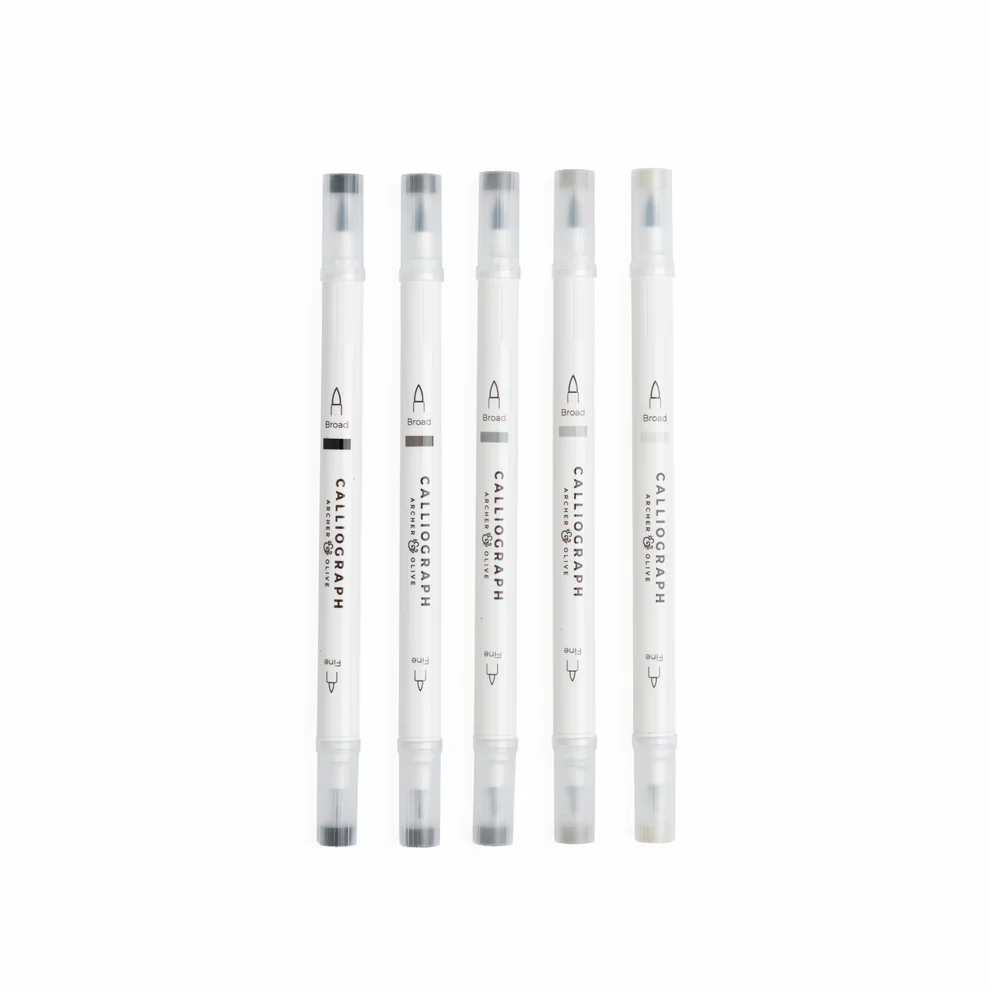 The Grayscale Calliographs set includes 5 dual-tipped brush pens in a full range of versatile gray tones. Perfect for bullet journaling, hand lettering, and creative projects, these pens are designed for smooth lettering, shading, and blending. Each pen features a flexible brush tip for bold, expressive strokes and a fine tip for crisp details, giving you precision and versatility in one tool.