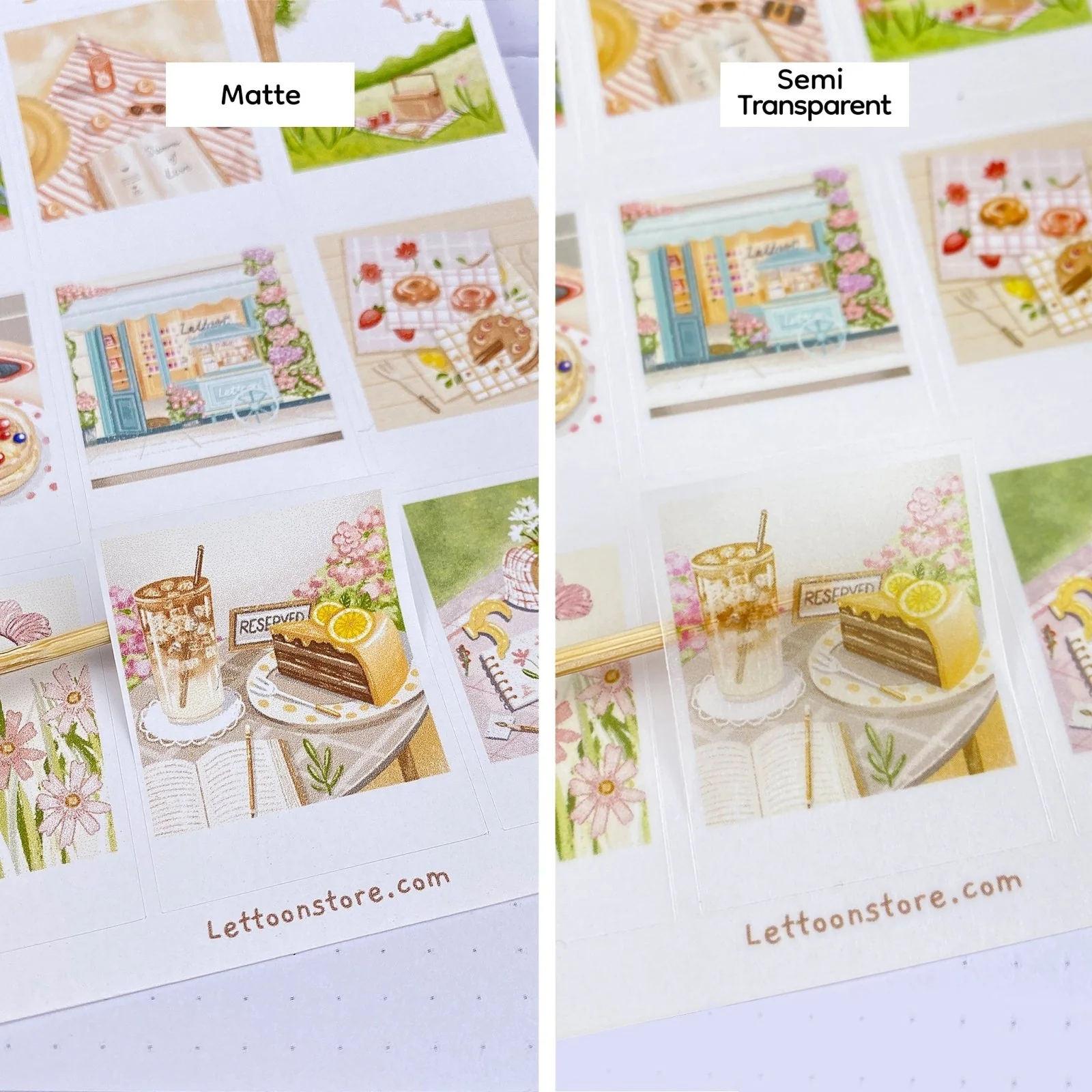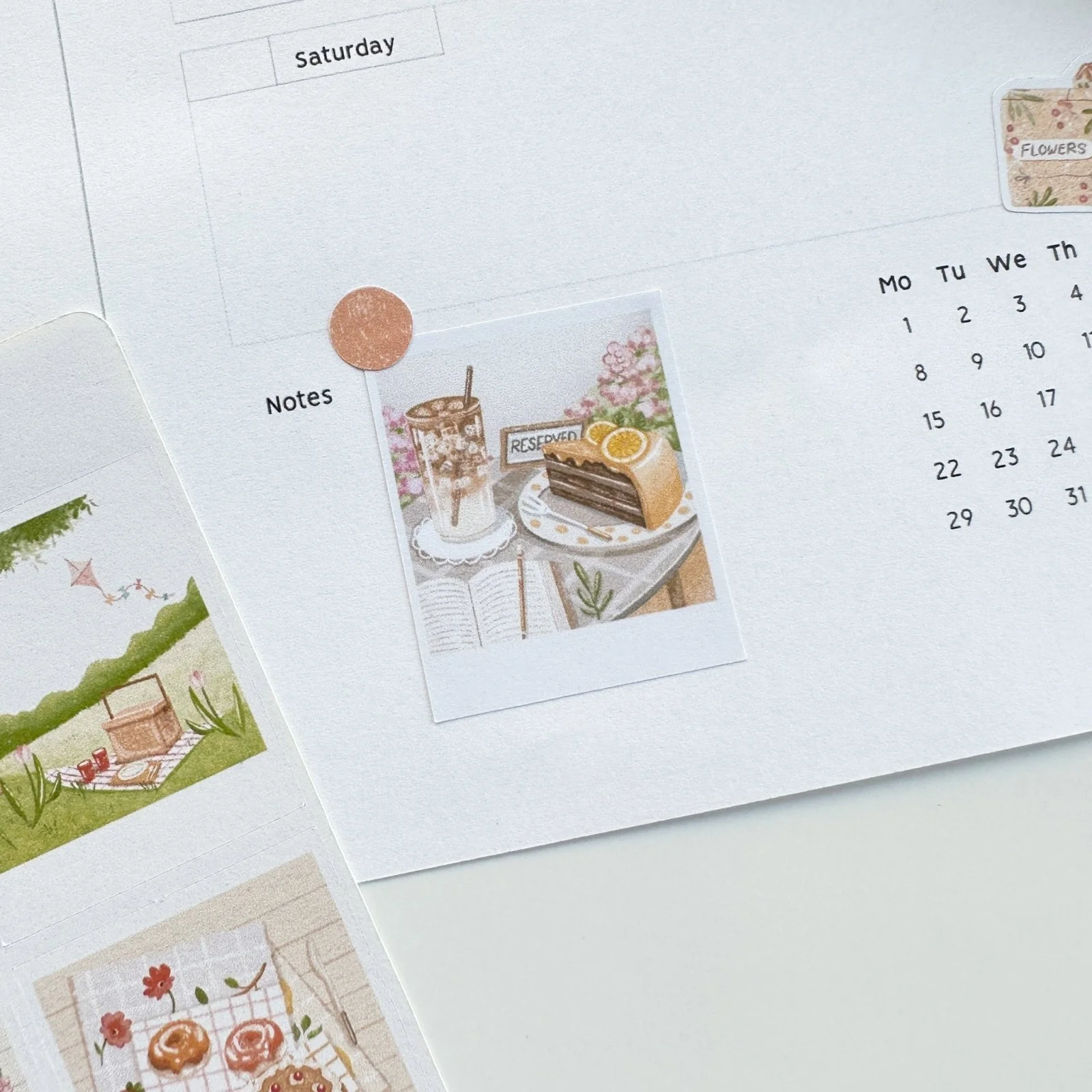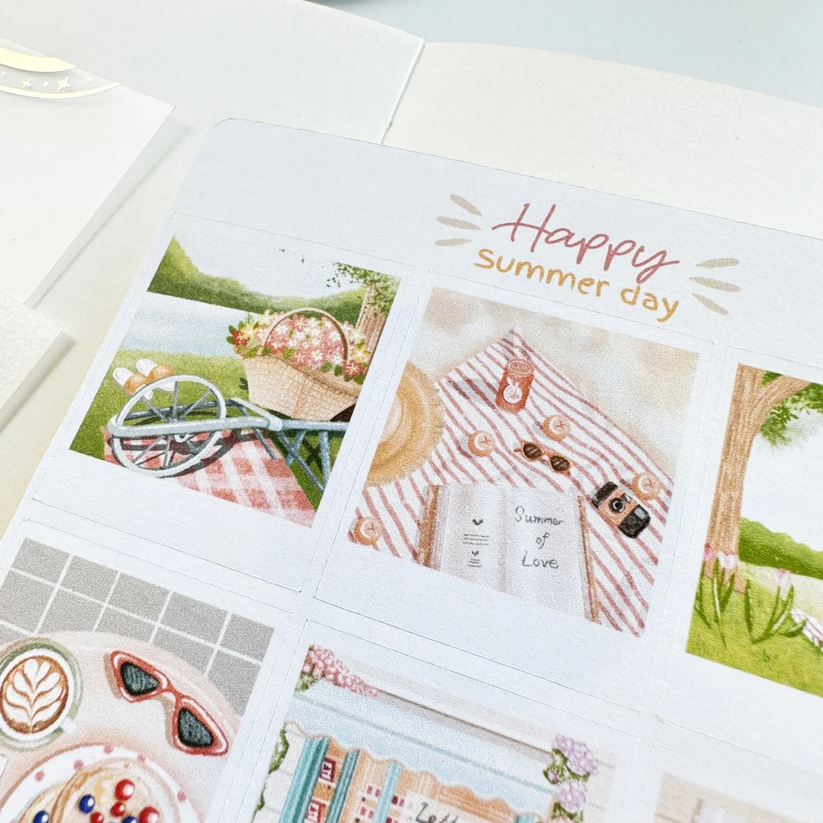 Happy Summer Day sticker sheet with Polaroid pictures of beautiful summery scenes to decorate your bullet journal, planner, scrapbook, and more!