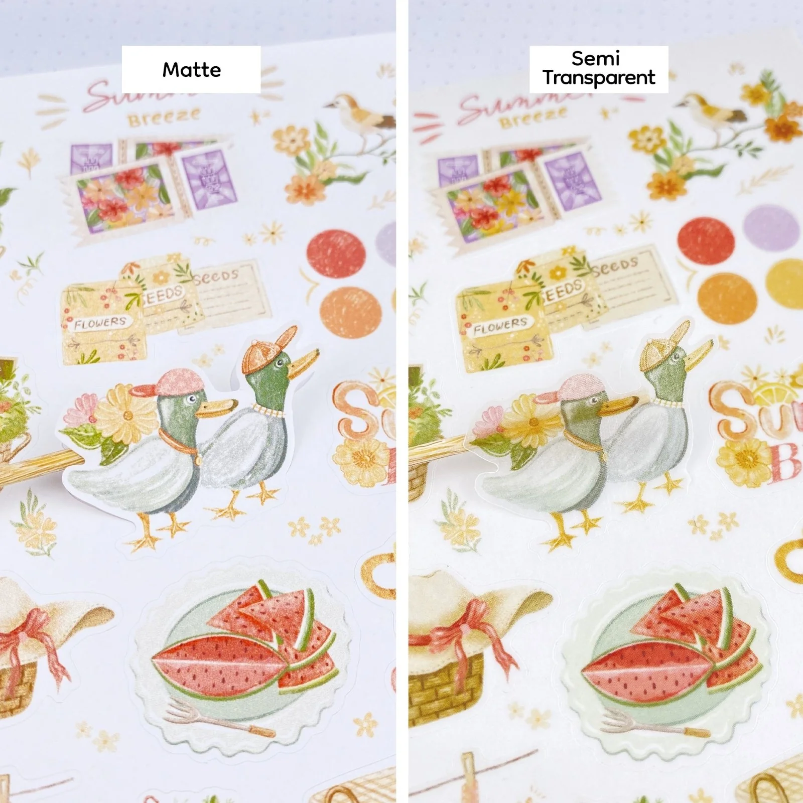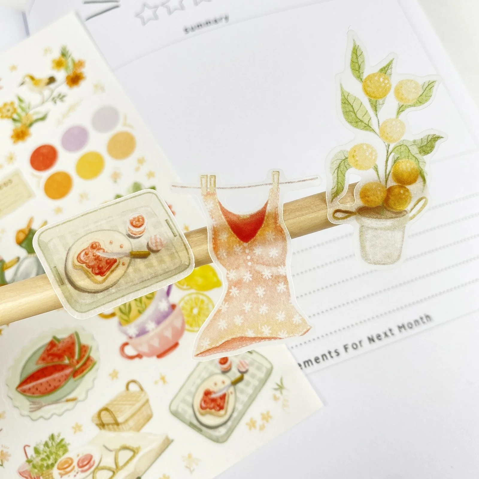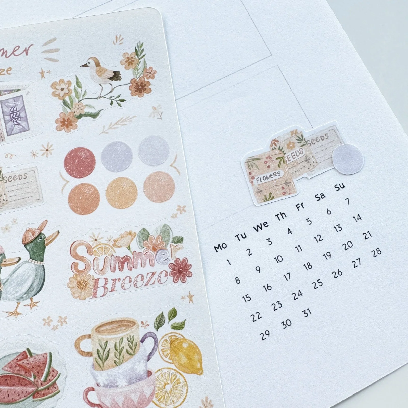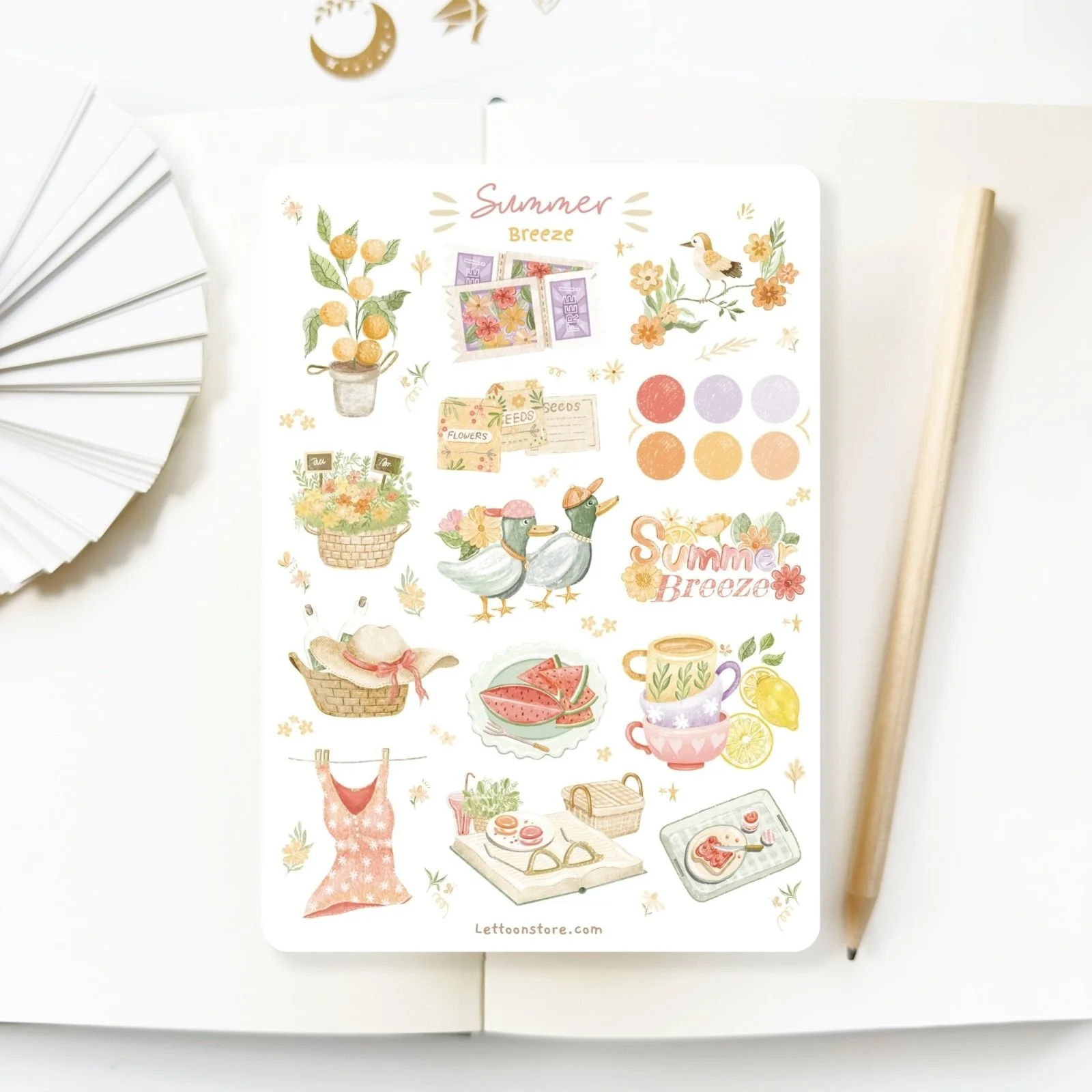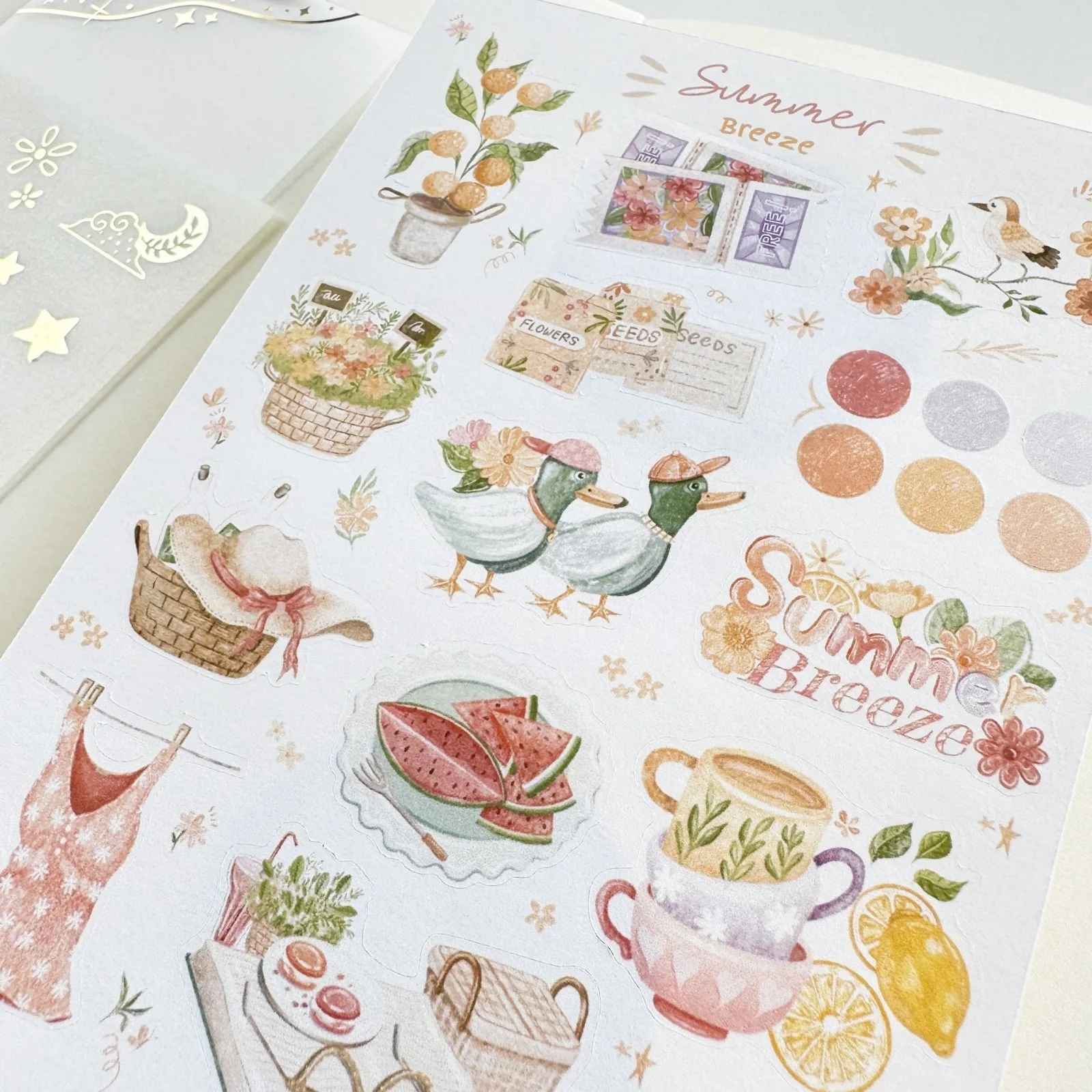 Summer Breeze has a summer aesthetic and contains a mini orange tree, lemon tea, a beautiful pink dress, a summery hat, ducks, color palette dots, and many more! Bring your ideas to life instantly with these beautiful stickers.