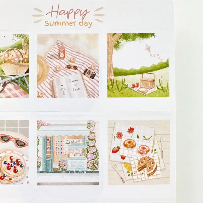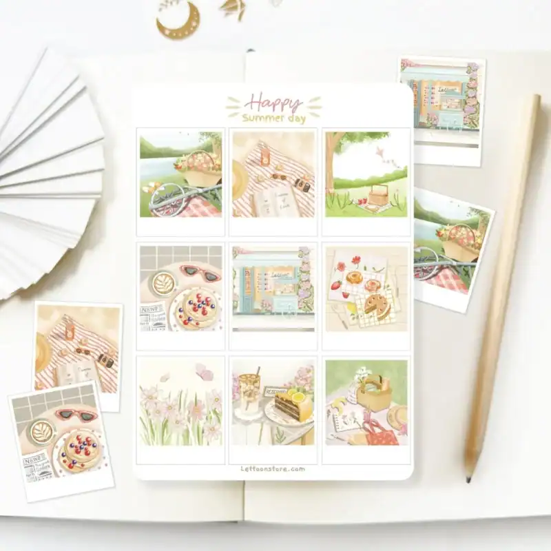 Happy Summer Day sticker sheet with Polaroid pictures of beautiful summery scenes to decorate your bullet journal, planner, scrapbook, and more!