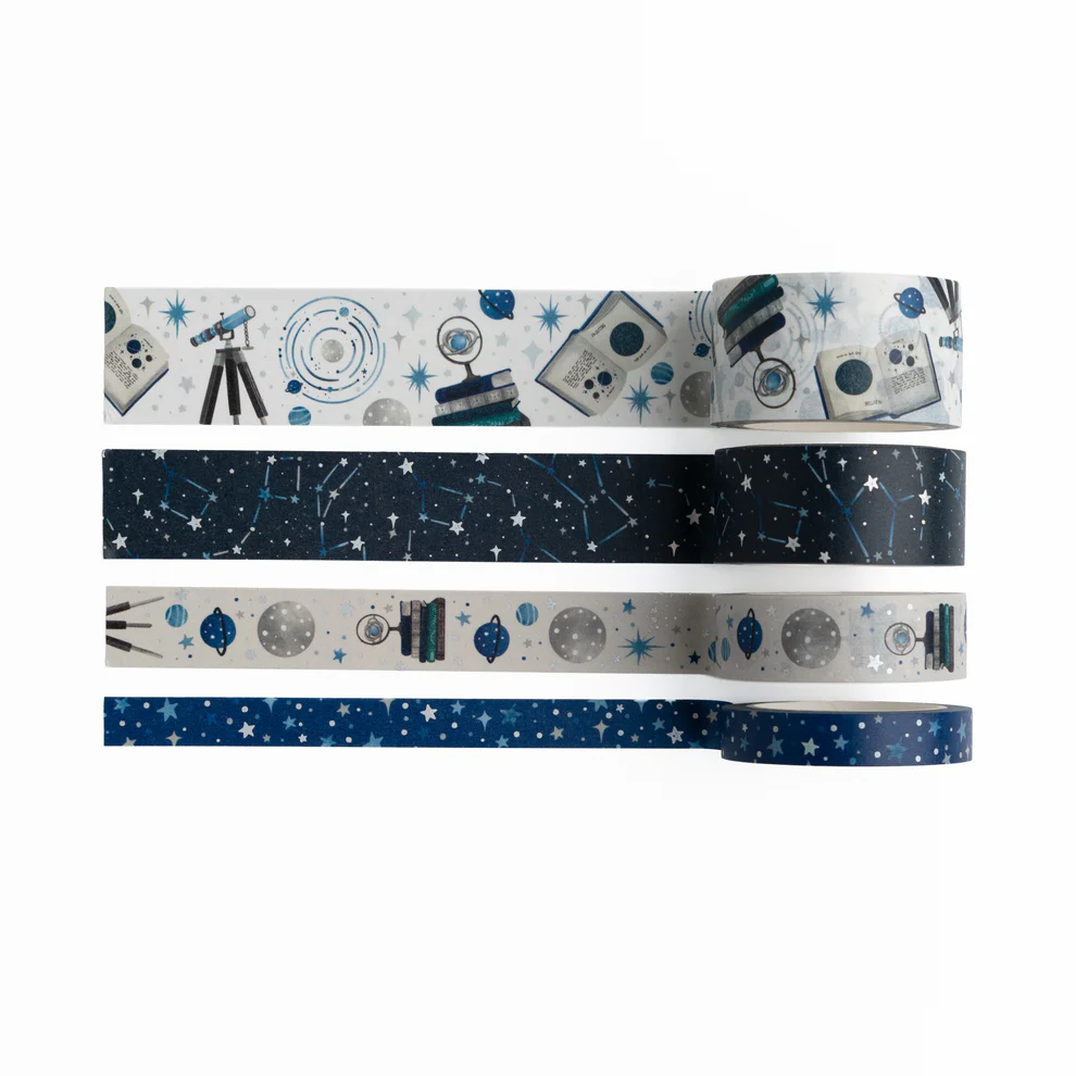 A dreamy celestial washi tape set inspired by stargazing, constellations, and drifting meteor trails. This coordinated collection features star-scattered skies, astronomy books, telescopes, planets, and deep midnight tones—perfect for adding a cosmic touch to planners and creative spreads.